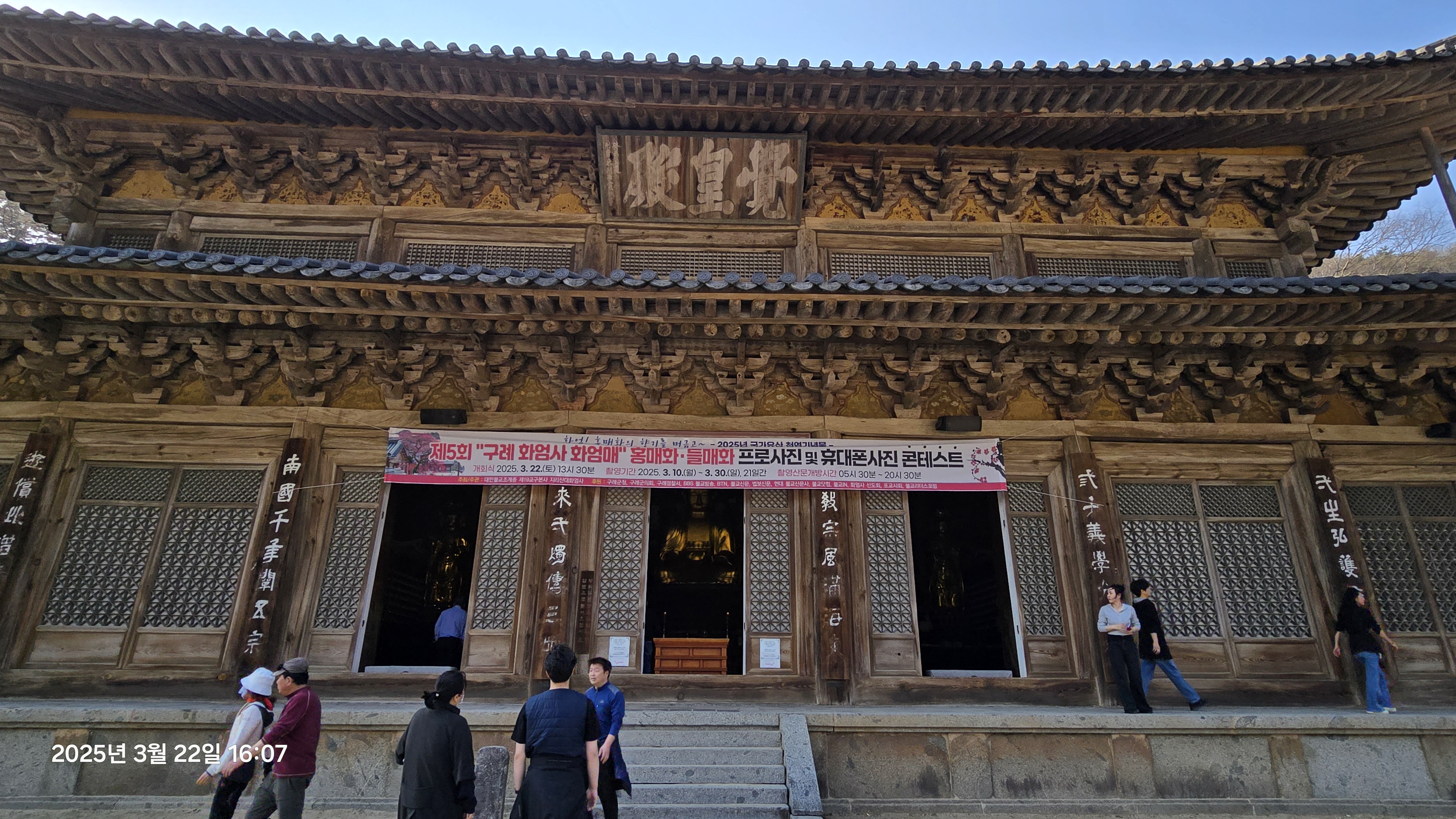 셔틀로 입구에 도착후 각황전을 지나 홍매화가 있는 곳까지 도보로 약 5~10분 정도 이동하면 됩니다.
