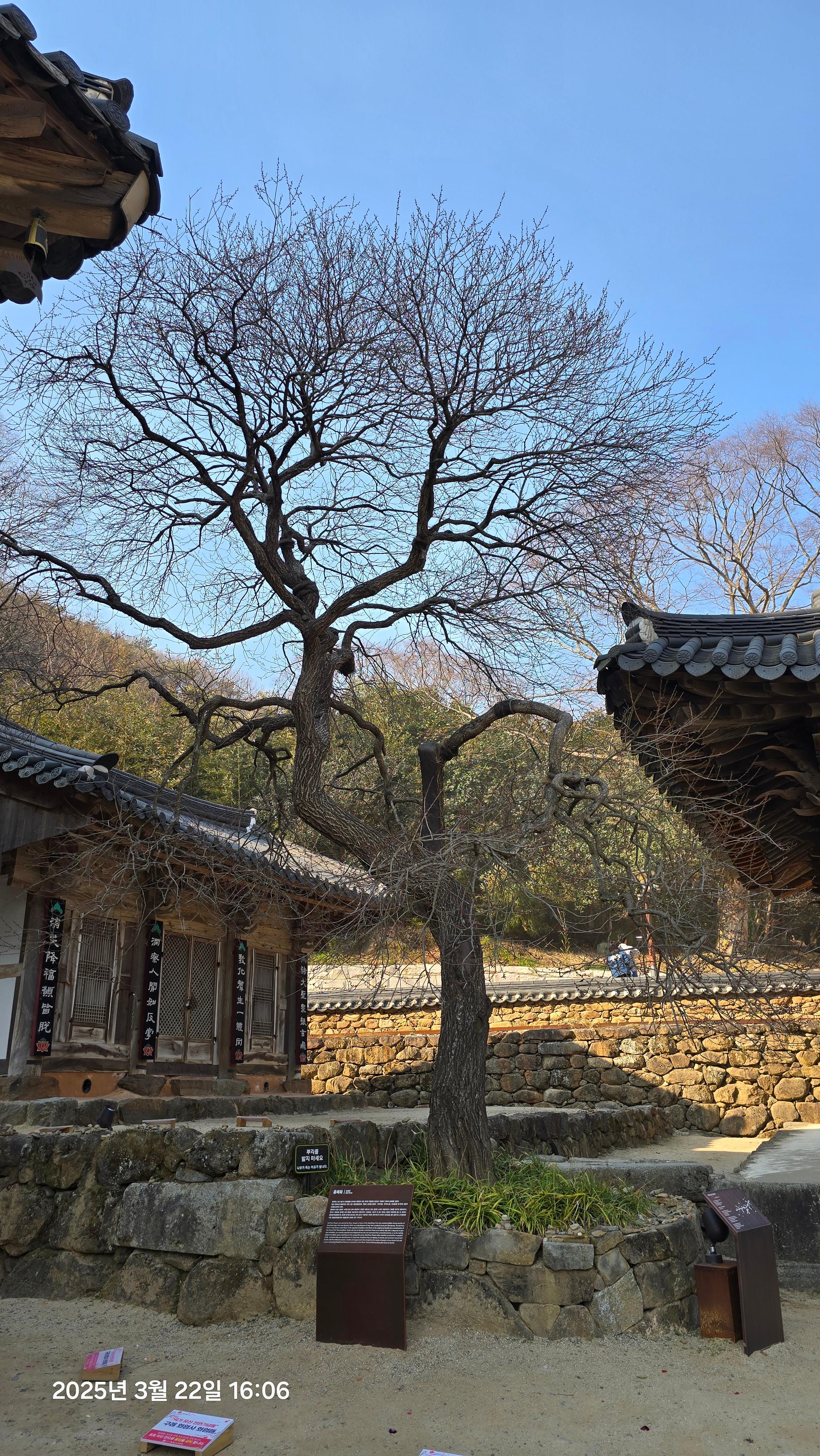 화엄사 경내에 위치한 각황전 뒤편의 홍매화는 500년 이상의 세월을 간직한 고목으로, 그 수령만으로도 큰 가치를 지닙니다. 이 나무는 한국에서 가장 오래된 홍매화 중 하나로 손꼽히며, 가지의 흐름과 꽃의 색감이 특히 아름다워 많은 사진작가들이 찾는 명소입니다.