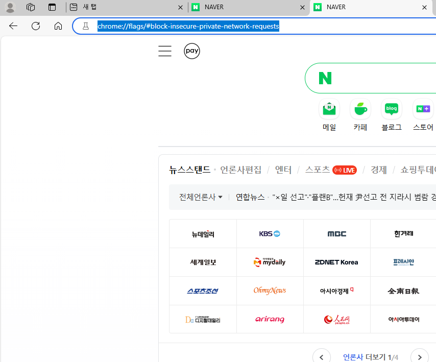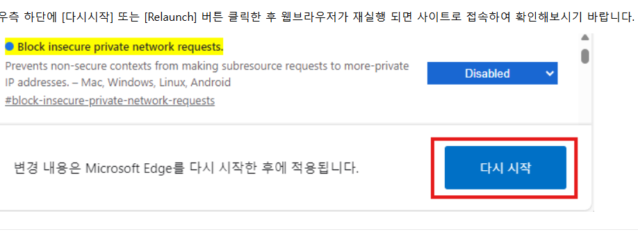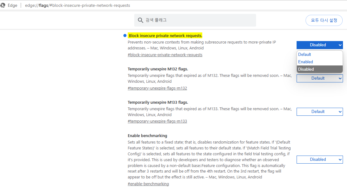 이동된 페이지에 저렇게 노란색 으로 된 'Block insecure private network requests.' 옆에 보이는 메뉴를 드롭다운 해서
