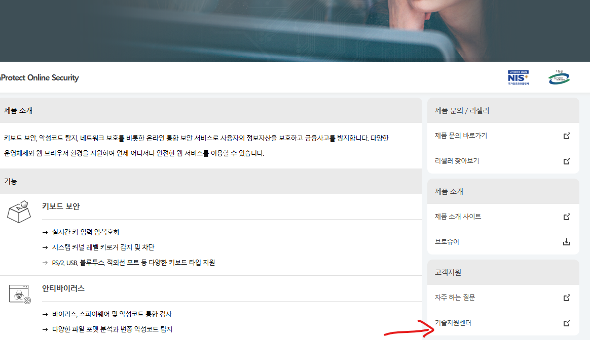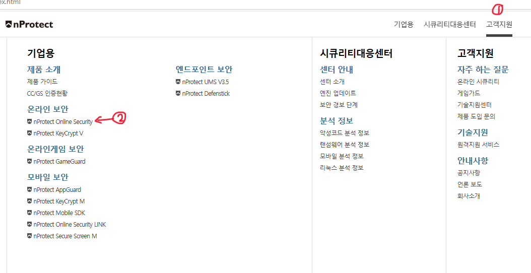 검색해서 들어간 홈페이지 우측 상단에 '고객지원' 클릭 → 펼쳐진 메뉴에서 좌측 '온라인 보안'에서 'nProtect Online Security' 를 클릭해요
