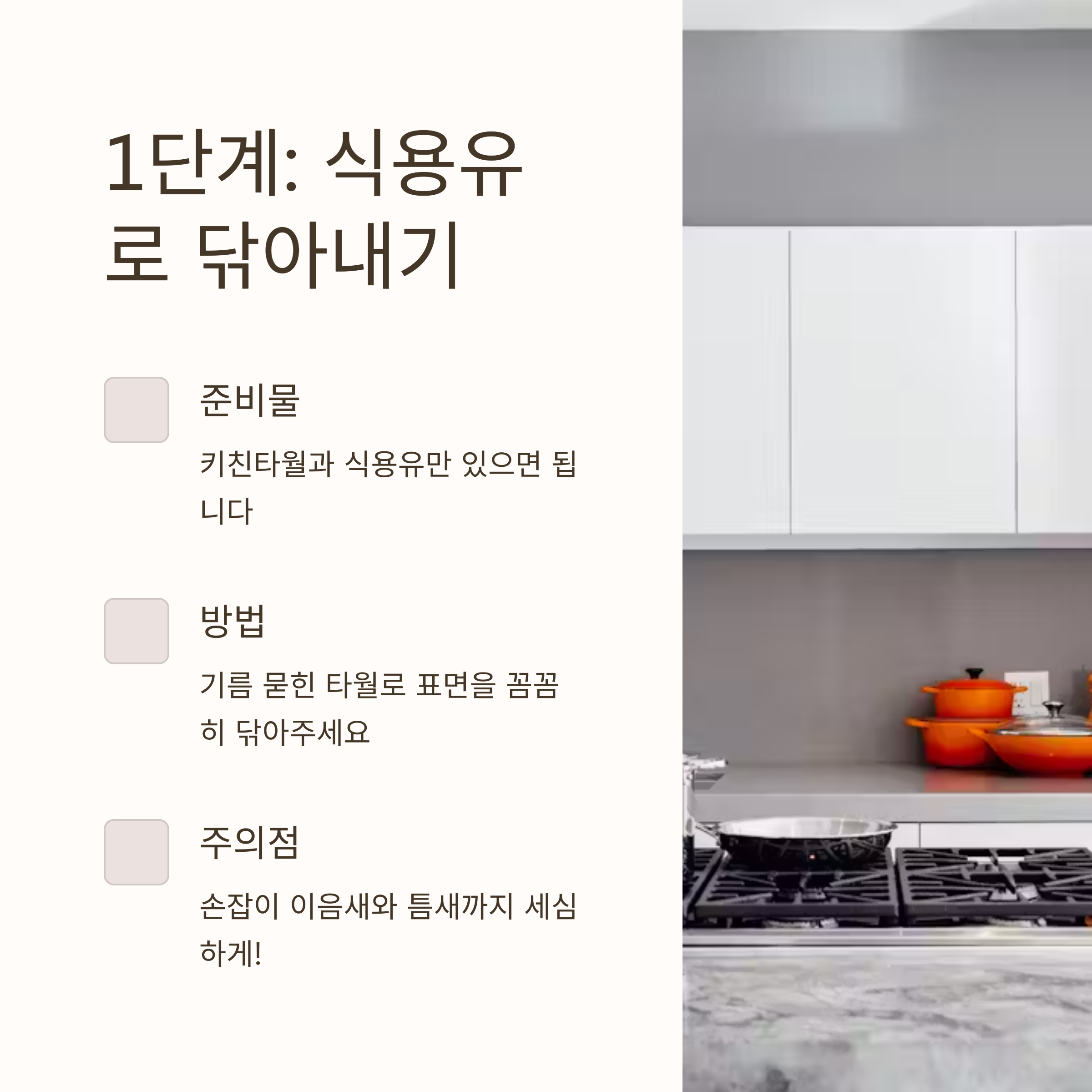 1. 식용유로 닦아내기: 키친타월에 식용유를 묻혀 제품 표면을 꼼꼼하게 닦아줍니다. 이 과정에서 연마제가 기름에 녹아 나옵니다. 특히 손잡이 이음새나 뚜껑 틈새 등은 세심하게 닦아주세요.