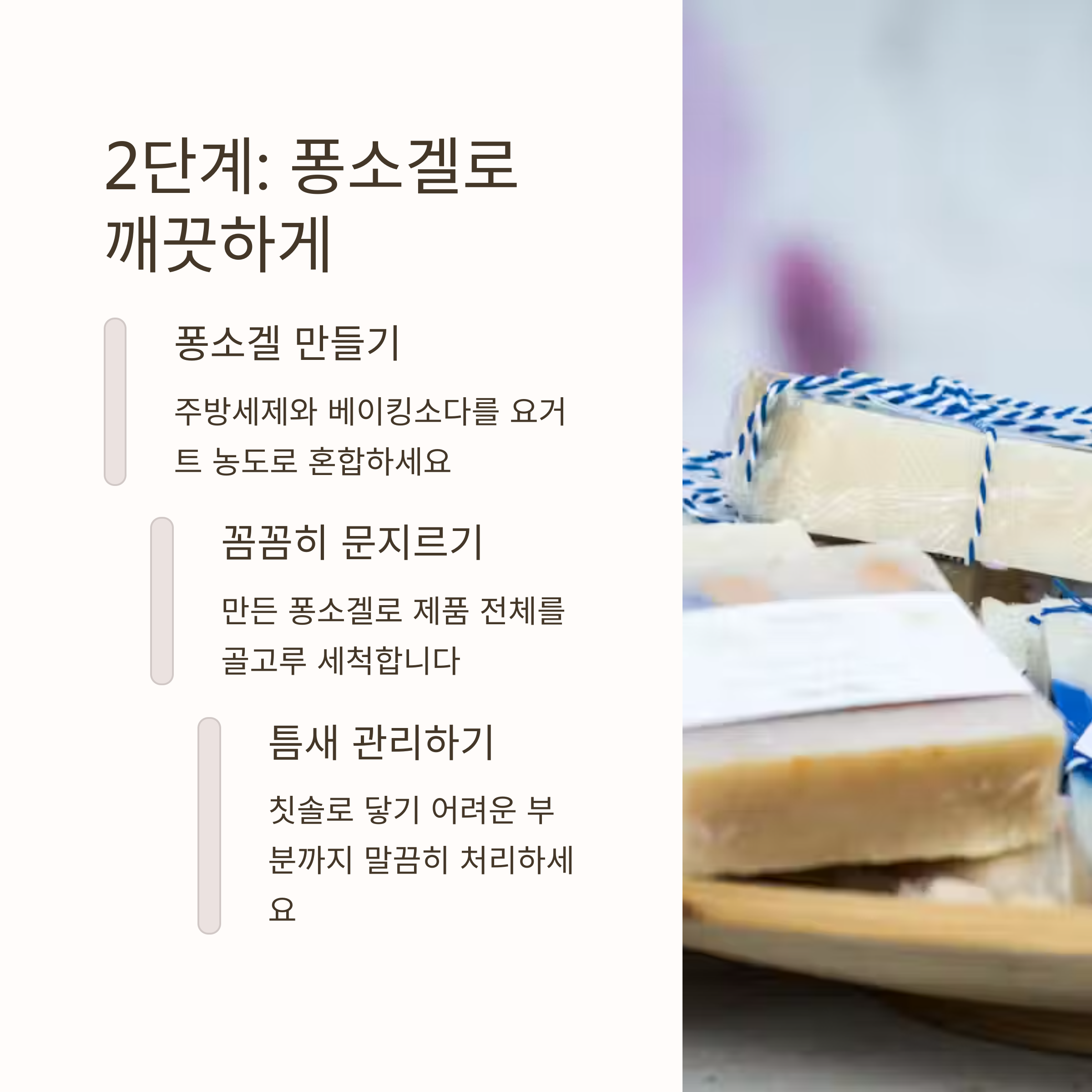 2.'퐁소겔' 세척: 주방세제와 베이킹소다를 섞어 꾸덕한 요거트 정도의 농도로 만든 '퐁소겔'을 사용하여 제품을 세척합니다. 칫솔 등을 활용하여 틈새까지 꼼꼼하게 문질러 주세요.
