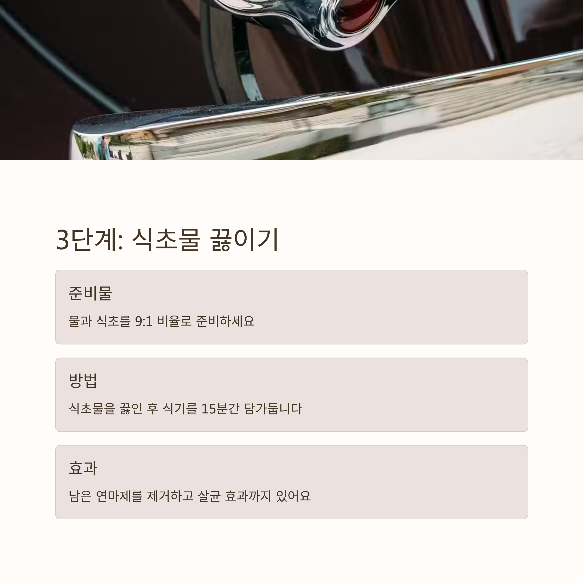 3.식초물 끓이기: 물과 식초를 9:1 비율로 섞어 끓인 후, 제품을 15분 정도 담가둡니다. 이 과정은 남아 있는 연마제를 제거하고 살균하는 효과가 있습니다.