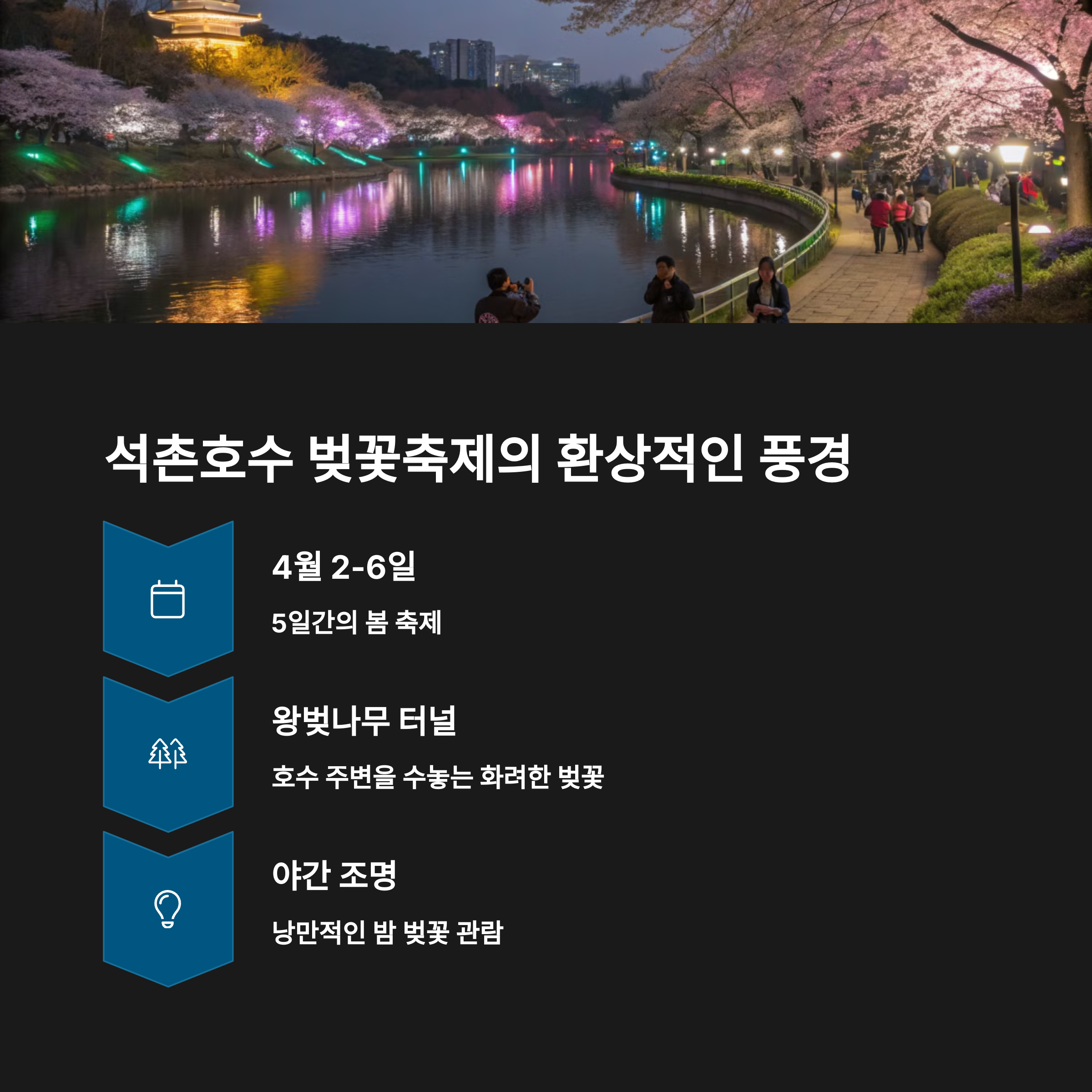 | 조용한 벚꽃길과 포토존이 많은 삼익아파트 일대 | 거리공연, 콘서트, 체험존이 가득한 봄 축제 | 야간 조명과 음악으로 낭만 가득한 석촌호수 밤 |